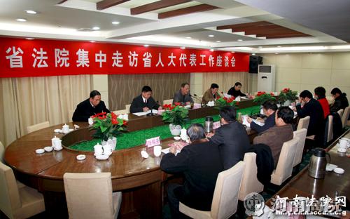 座谈会上,省高级人民法院就省高院狠抓执法办案,全力服务中原经济区建设;依法严惩涉及食品安全案件,保护人民群众生命健康安全;积极参与社会管理创新,化解矛盾纠纷;继续狠抓党风廉政建设,确保公正廉洁司法;狠抓基层基础建设,夯实社会和谐稳定基石等方面工作进行了通报。与会的驻宛省人大代表踊跃发言,代表们首先对全省法院一年来各项工作取得的成绩给予充分肯定,对全省法院广大法官公正司法、为民服务的精神给予高度评价,对法院面临的困难给予呼吁,对法院工作应当注意的问题和需要改进的方面提出中肯的意见。并在加强基层法院建设、加强法官队伍建设、廉政建设、维护法院判决严肃性等方面积极建言献策,提出建设性的意见和建议。