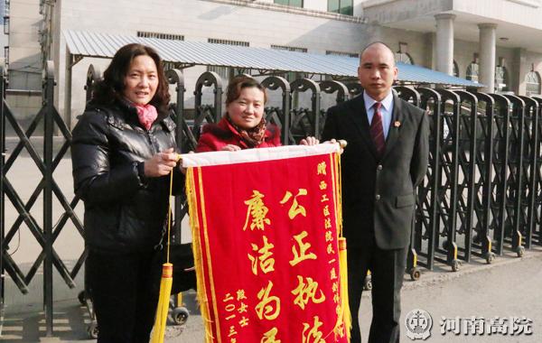 1月20日,一起离婚案件当事人段女士和家人一道将写有“廉洁为民,公正执法”的锦旗送到洛阳市西工区人民法院民一庭法官刘伟国手中,感谢法官主持公道,帮助其摆脱了纠纷、顺利开始新生活。