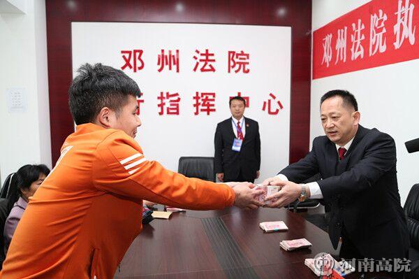 在随后召开的执行款兑现会上,邓州市法院党组副书记、副院长刘国磊向申请执行人发放执行款22万余元现金,并通过转账方式为一名申请执行人发放20万元执行款。