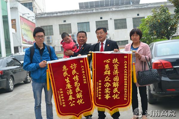 4月26日,内乡县人民法院爱心涌动、暖意浓浓。该县岞曲镇白杨村的村干部和村民李东自发将两面上书“访民情为民解忧,惠民生廉洁奉公”、“扶贫济困解民忧,心系群众办实事”的锦旗,送到了内乡法院精准扶贫工作队法官手中,表达对精准扶贫工作队法官的感激之情。