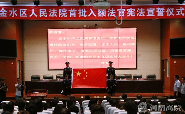 该院党组成员、政治处主任邓现民宣读了《河南省高级人民法院关于批准郑州市两级法院首批法官入额的决定》。随后,伴随着雄壮的中华人民共和国国歌,金水法院党组书记、院长蔡理亮带领59名入额法官面向国旗和宪法,庄严宣誓。两名入额法官代表发言,他们表示:在今后的工作中,要努力提升审判业务能力,把公正司法作为工作准则,把廉洁自律作为从业底线,确保承办的每一起案件都经得起历史的检验,做一名无愧于党、无愧于国家、无愧于人民的合格法官。