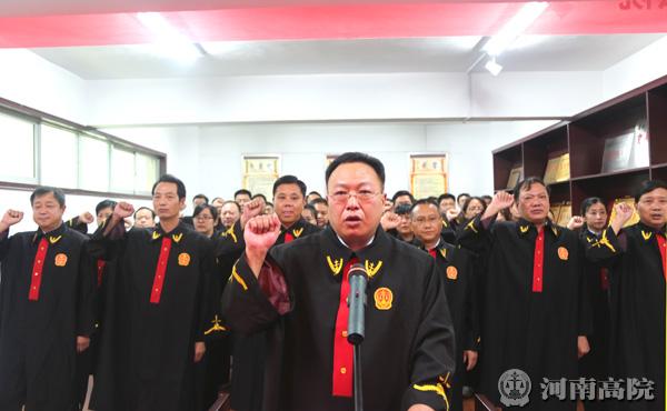 宣誓仪式开始后,法官们怀着崇敬的心情在国徽面前整齐列队,齐唱国歌。王宏伟院长身着法袍,左手紧按宪法,举起右拳,带领入额法官面向神圣的国徽庄严宣誓。法官们响亮的喊出了自己的名字,再次立下司法为民,维护正义,促进和谐的坚定决心。