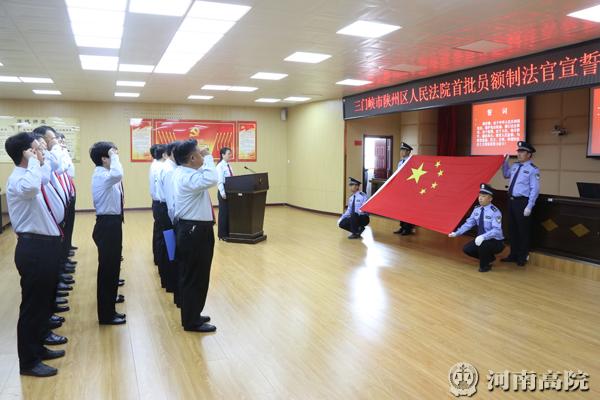 “我宣誓:忠于中华人民共和国宪法,维护宪法权威。履行法定职责,忠于祖国,忠于人民,恪尽职守,廉洁奉公,接受人民监督,为建设富强民主文明和谐的社会主义国家努力奋斗。”5月31日早上,三门峡市陕州区人民法院举行首批员额制法官宣誓仪式,在庄严的国歌声中,26名员额制法官面向国旗,高擎右拳,庄严宣誓。陕州区法院党组书记、院长卫秀萍领誓,党组成员、副院长马卢生主持。