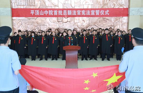 5月27日上午,平顶山市中级人民法院举办首批入额法官宪法宣誓仪式。65名首批入额法官参加宣誓。平顶山市委政法委、市人大选工委、有关领导及3名市人大代表、政协委员见证宣誓。平顶山中院党组书记、院长刘冠华领誓。宣誓仪式由平顶山中院党组成员、政治部主任张学玲主持。