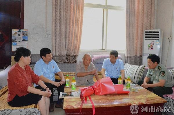 7月7日上午,平顶山市中级人民法院党组书记、院长刘冠华来到舞钢市尹集镇谢古洞村看望慰问新四军老战士刘见同志。舞钢市委常委、武装部政委李志恒,舞钢法院院长徐合林,尹集镇党委书记刘玉等陪同看望。