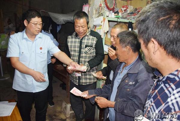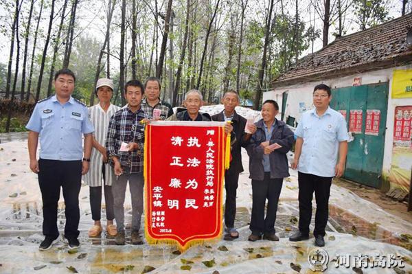 9月26日,柘城县人民法院执行局干警冒雨来到安平镇,为6名农民工送来了39000元的执行款。申请执行人周某、胡某等人的感动之情溢于言表,坚持把一面写着“清正廉明、执法为民”的锦旗送到执行局副局长李洪亮手中,以表达对执行法官的感激之情。