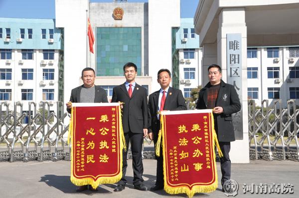 11月20日,寒潮来袭,北风呼啸,天空灰蒙蒙,大街上冷冷清清。然而寒冷的天气并没有阻挡张某等人的脚步,刚一到上班时间,他们便带着两幅锦旗早早赶到商丘市睢阳区人民法院。值班法警拦住了这些“不速之客”。“警官,你让我们进去吧,俺是给张鹏法官送锦旗的。开发商欠俺的钱,一年多了都没要来,张鹏法官40天就帮俺要回来了!这份情您一定让俺表达到。”张某很是激动。