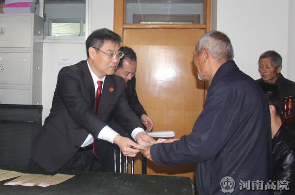 日前,在平顶山市卫东区人民法院举行的“为农民工讨薪”执行款发放仪式上,卫东区法院院长李俊峰将六万余元执行款,现场发放到申请执行人手中。“在这里,我代表大伙向执行局法官说一声:你们辛苦了!感谢你们为我们追回了血汗钱!谢谢!”仪式上,农民工代表张某接到执行款后激动地说。
