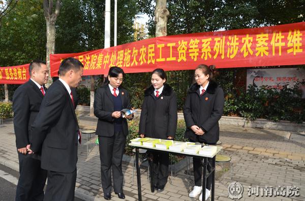 为切实保护农民工合法权益,确保第九次拖欠农民工工资案件集中办理等系列涉农维权活动取得实效,11月21日上午,郏县人民法院联合郏县法律援助中心共同走上街头,开展涉农维权专题法制宣传活动。郏县法院党组书记、院长宋景婵到现场进行指导。