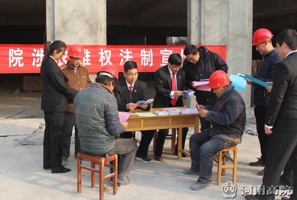 12月4日下午,安阳市殷都区人民法院组织法官宣传志愿者到辖区建筑工地,开展涉农维权专项法律宣传活动。