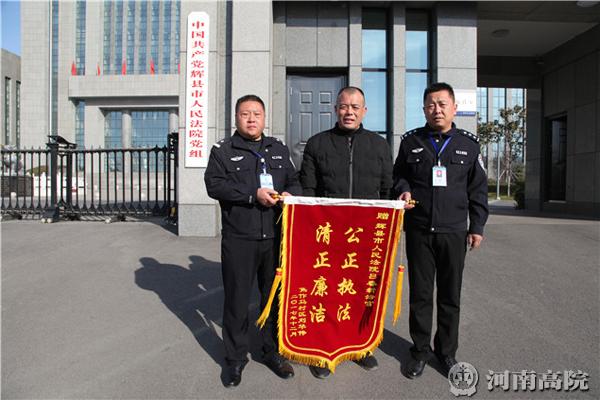 12月11日上午10时许,家住焦作市马村区的刘某将一面写有“公正执法,清正廉洁”的锦旗送到了辉县市法院执行局吕春新法官的手中,以表达其对执行法官的感激之情。