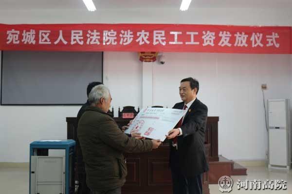 “感谢执行局!”12月28日下午,南阳市宛城区人民法院举行了涉农民工工资发放仪式,宛城区法院党组书记、院长魏建国将涉及262名农民工工资的148万余元执行款现金支票当场发放给农民工代表,领到工资支票的农民工高举着支票高兴地大声说。