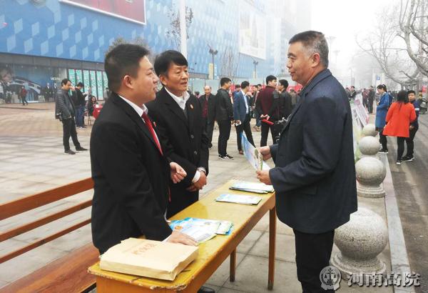 3月15日上午,平顶山市卫东区人民法院的法官来到万达广场前,开展消费者维权法治宣传活动,向群众普及维权知识,提供法律咨询。