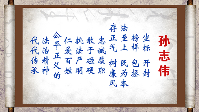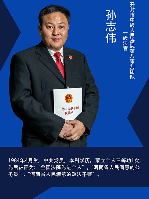 孙志伟,男,1984年4月生,中共党员,本科学历,开封市中级人民法院第八审判团队一级法官,先后从事刑事审判和民事审判工作。他曾成功审结了涉案金额37亿、受害群众近3000人的某投资担保公司非法吸收公众存款案等一批大案要案。今年以来审结二审民事案件217件,成功调解22件家庭、邻里矛盾激化的案件。他担任河南大学附中等3所中小学的法治副校长,到学校、社区、机关、企业普法宣传7次,受众6000余人次。担任疫情防控党员突击队队长,动员社会力量为群众捐赠11000元防疫物资,协调有关单位为2400名村民免费投保疫情保险。荣立个人三等功1次,先后被评为“全国法院先进个人”“河南省人民满意的公务员”“河南省人民满意的政法干警”。