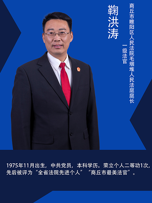 鞠洪涛,男,1975年11月出生,中共党员,本科学历,商丘市睢阳区人民法院毛堌堆人民法庭庭长,一级法官。今年以来带领团队审结案件487件,服判息诉率90.89%。他扎根基层法庭11年,善作基层调解工作,牵头组织人民调解员、村干部、当地名人、村民代表,共同化解了大量矛盾纠纷。针对当地离婚案件多的现状,利用休息时间入户家访、温情调解,使多个家庭破镜重圆。他善用群众语言和老百姓交流,拉近了与群众之间的距离,让矛盾润物无声地化解,三年来通过调解、撤诉结案696件。荣立个人二等功1次,先后被评为“全省法院先进个人”“商丘市最美法官”。