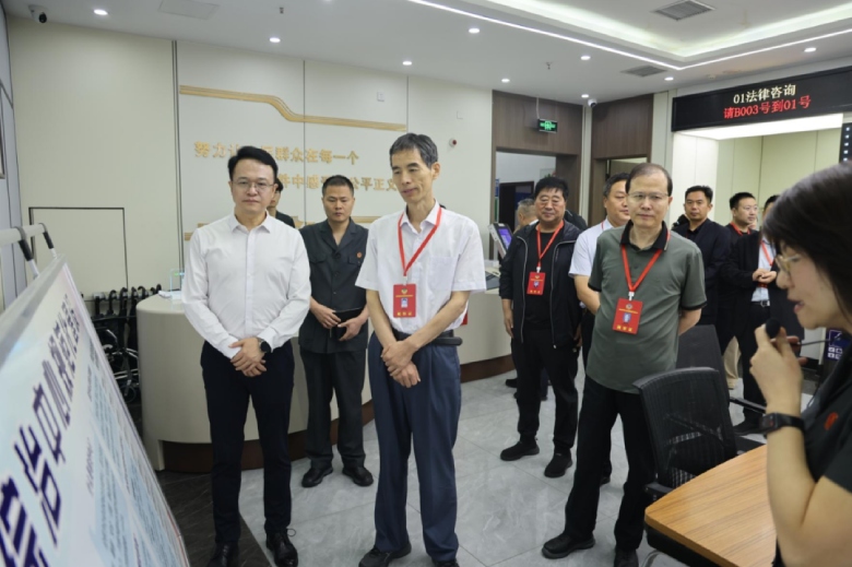 视察组一行到管城法院诉讼服务大厅察看了诉讼服务设备、便民服务设施、人民调解室等,详细了解了法院立案工作情况。随后,到南曹人民法庭参观了诉调对接中心、人民调解室、代表委员联络之家等地,详细了解了诉前调解、知识产权审判工作情况。