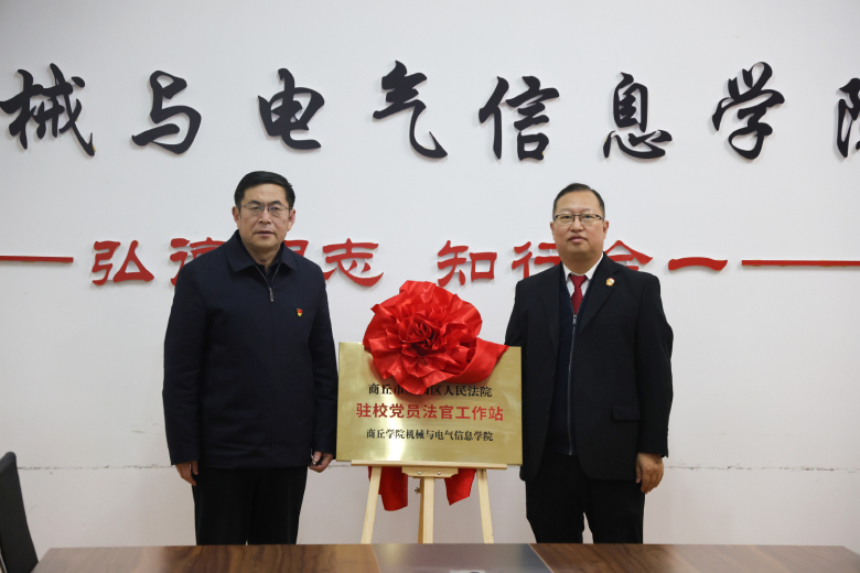 梁园区法院机关党委副书记、驻校法官戚浩,商丘学院机械与电气信息学院党总支书记、院长蒋学华共同为“驻校党员法官工作站”揭牌。