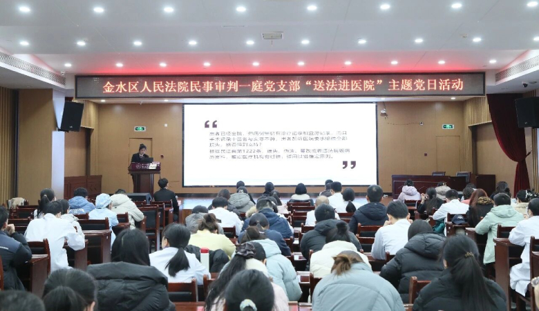 为促进医疗纠纷源头预防和化解,构建和谐医患关系,12月24日,郑州市金水区人民法院民事审判一庭党支部聚焦医疗损害责任纠纷,到郑州人民医院开展“送法进医院”主题党日活动,医院院领导及医务人员一百余人到场聆听。