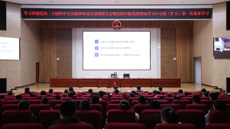 1月6日,信阳中院举办学习贯彻党的二十届四中全会精神专题宣讲报告会,邀请信阳市委党校副校长、教授张清改以《为实现社会主义现代化接续奋斗——深入学习贯彻党的二十届四中全会精神》为题作专题辅导。信阳中院在家院领导、全体干警参加会议。