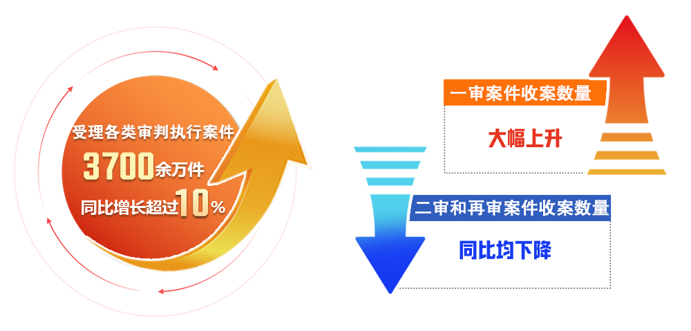 司法审判工作总体情况。人民法院紧紧围绕“努力让人民群众在每一个司法案件中感受到公平正义”目标,做实“从政治上看、从法治上办”,依法公正审理各类案件。受理各类审判执行案件(不含先行调解成功案件,下同)3700余万件,同比增长超过10%。人民法院更加严格贯彻落实立案登记制度要求,一审案件收案数量大幅上升的同时,二审和再审案件收案数量同比均下降,一审裁判被二审改判、发回重审的比例和生效裁判被再审改判、发回重审的比例同比均下降,人民法院裁判的公正性、稳定性、权威性稳步提升。截至2025年12月底,全国法院两年以上未结诉讼案件数量同比下降约两成,长期未结诉讼案件清理工作成效明显。