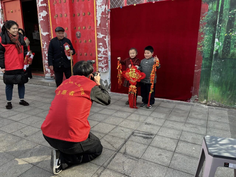 在社区淇河书屋门口,一个以中国红和中国结元素为主的简易摄影背景搭建了起来,一场“我们的全家福”公益拍摄活动正在这里温馨开展,奶奶手执鎏金福字,笑眼盈盈;稚气未脱的孩童手举喜庆鞭炮,雀跃欢欣……志愿者用镜头记录下一个个幸福的家庭瞬间。