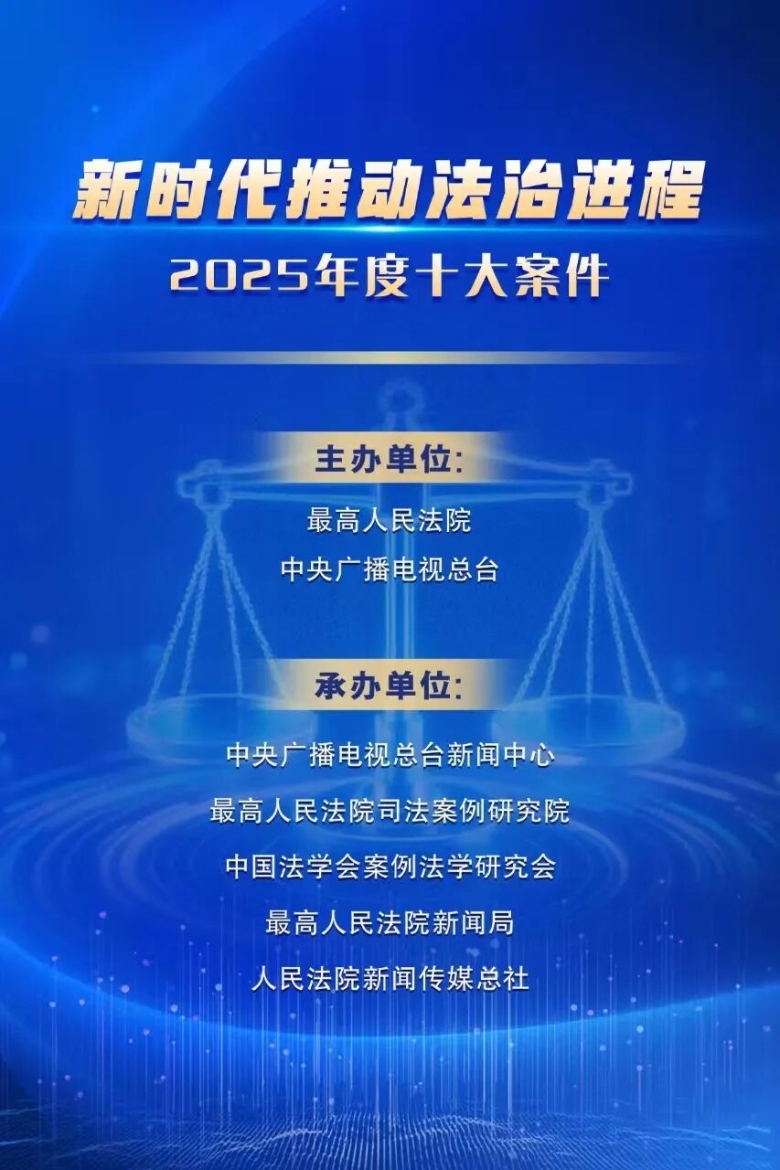 作为一年一度全民共享的法治公开课,“新时代推动法治进程年度十大案件”宣传活动至今已成功举办九届。2025年度活动由中央广播电视总台新闻中心、最高人民法院司法案例研究院、中国法学会案例法学研究会、最高人民法院新闻局、人民法院新闻传媒总社共同承办。本届活动通过对全国法院过去一年审理的各类案件进行筛选和初评,选出了50个具有较大影响力的典型案件进行网络投票。经专家委员会评选,并综合网民投票结果,最终评选出新时代推动法治进程2025年度十大案件和十大提名案件。
