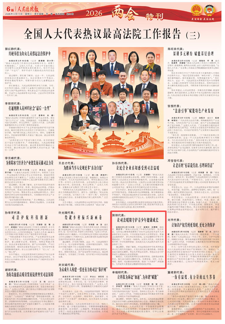 “最高人民法院工作报告内容翔实、亮点纷呈,尤其是以精准数据展现了2025年全国法院未成年人司法保护的扎实成效,不仅对侵害未成年人犯罪零容忍,更通过全链条保护、多元共治筑牢防线,让司法暖阳守护青少年健康成长。”作为基层一线教师,全国人大代表、河南省南阳市第一中学校教师郭丽一直高度关注人民法院未成年人司法保护工作。