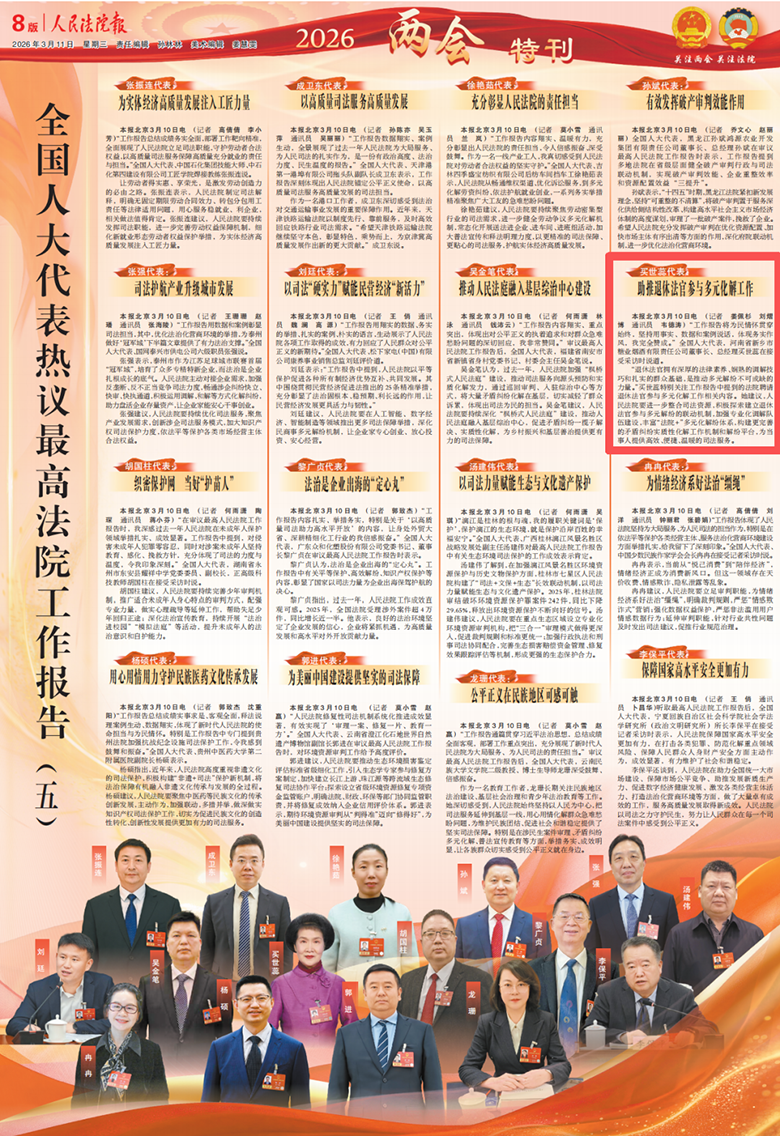 “退休法官拥有深厚的法律素养、娴熟的调解技巧和扎实的群众基础,是推动多元解纷不可或缺的力量。”买世蕊特别关注工作报告中提到的法院聘请退休法官参与多元化解工作相关内容。她建议,人民法院要进一步整合司法资源,积极探索建立退休法官参与多元解纷的联动机制,加强专业化调解队伍建设,丰富“法院﹢”多元化解纷体系,构建更完善的矛盾纠纷实质性化解工作机制和解纷平台,为当事人提供高效、便捷、温暖的司法服务。