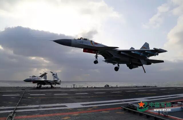 歼-15舰载战斗机即将阻拦着舰。李唐 摄